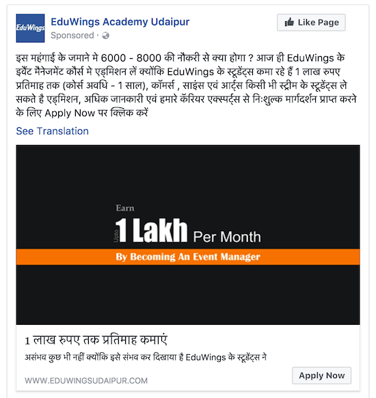 Varun runs an Event Management Course called EduWings at Udaipur. He wanted to have more students for his course. So he tried his hands at Facebook Advertising. He was able to get a 100x ROI on his Facebook Ad Spend! Yes, he spent Rs.5,000 on Facebook Ads and got a return of Rs.5,00,000 in revenue. Let’s have a look at what Varun did.