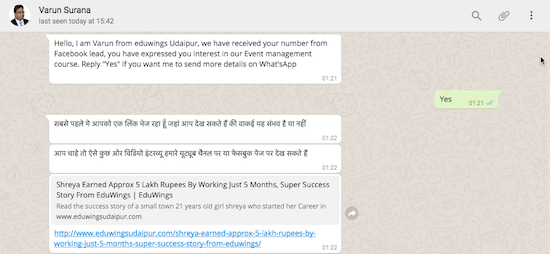 This builds enormous trust right out of the gate and positions Varun and EduWings as an authority in the market. Then, he sends them the requested information about the Event Management Course. Once they have gone through the information, he answers all of their questions on What’sApp.