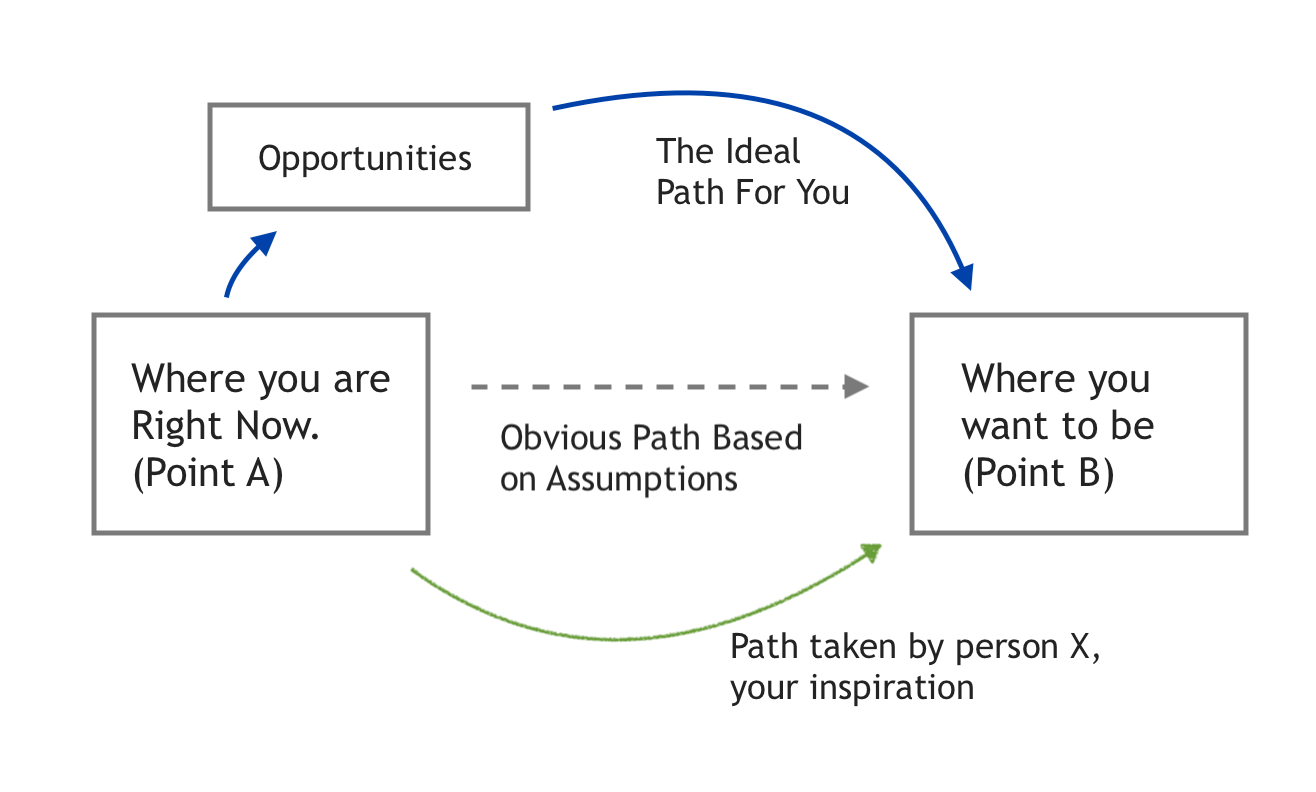 If you worry too much about the path to take to reach your goal, there is a high chance that you choose the most obvious path that leads straight to the goal. This “obvious” path is usually based on your life experience and what you have at this point in time. But your life experience is limited.