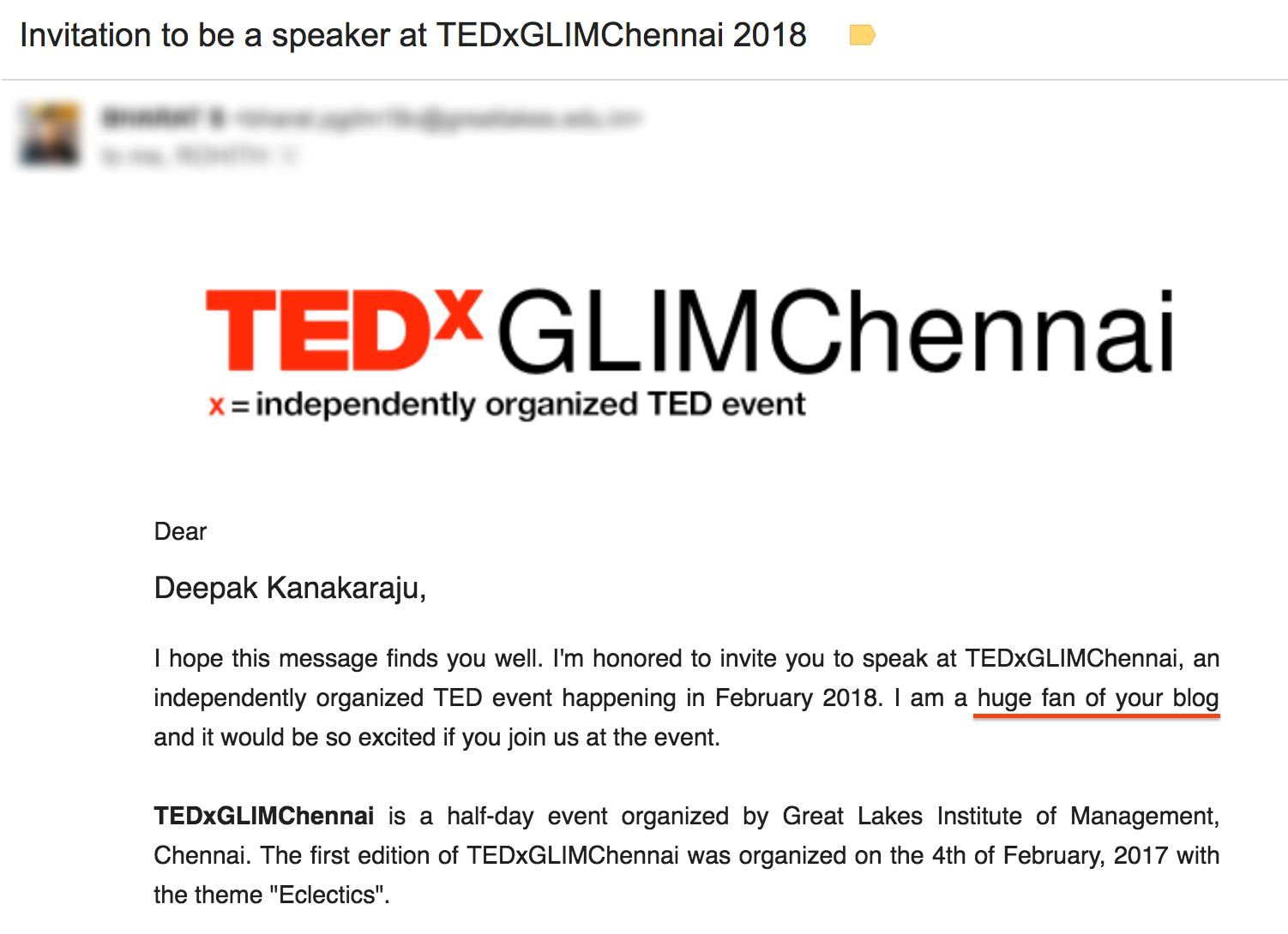 The very TEDx invitation happened because of blogging and the invitation email says that he is a huge fan of my… blog! Apart from being a blogger, I am also teaching blogging to others and I have enrolled 2,500+ students for my 100-day blogging course. I am also planning to launch a blog on blogging at LearnBlogging.com