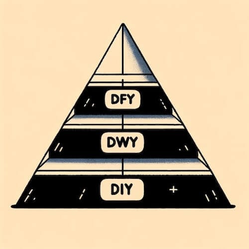 At the top of the pyramid, it's done for you services. You help your customers reach their goals by doing it for them. DFY can be building landing pages, content, email marketing or sales for your clients (in the digital marketing field). You charge high for DFY services because you are doing it for them and you cannot do it for everyone. The pricing for this will be high-ticket.