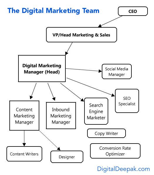 This is how the digital marketing team is structured within the organization. If a company is small, multiple roles are taken up by the one digital marketer.