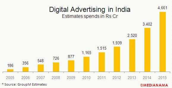 This change has forced many CEOs and Co-founders of startup companies to learn and execute digital marketing themselves. Startups cannot afford to be slow and they need to adapt to the change in market conditions. There is already a huge growth in digital marketing spends in India. Here’s a chart from MediaNama & Group M.
