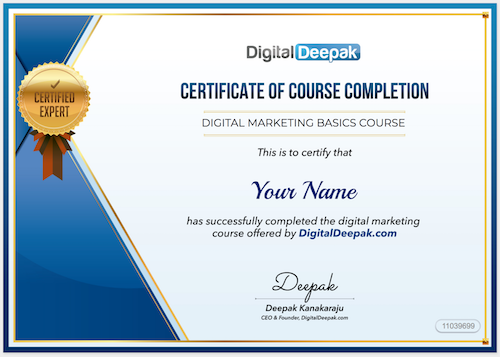If you have completed the free digital marketing course from Learn.DigitalDeepak.com you are eligible to get a free course completion certificate from DigitalDeepak.