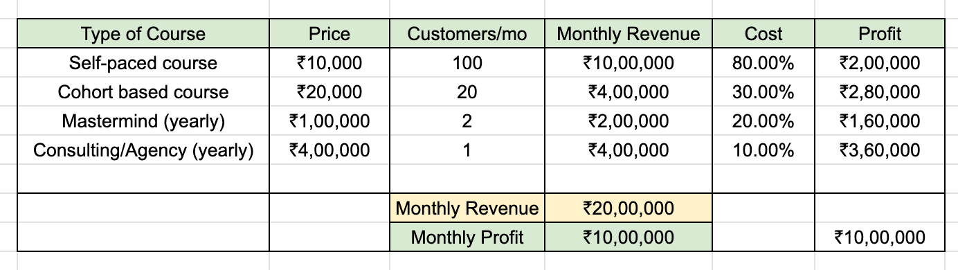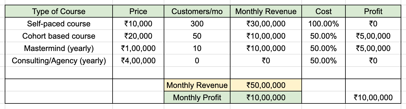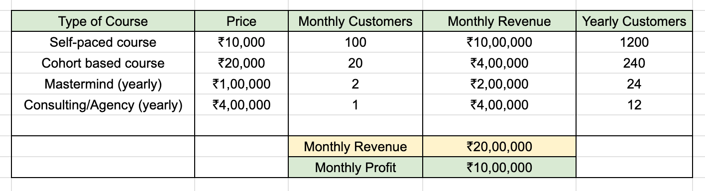 The above chart shows a sample business-plan where you sell 100 units of your self-paced course, 20 units of a cohort based course and 24 people yearly in your mastermind program at 1 lakh per year membership. You will also be able make money directly with client work and personalized services. You can charge 4 lakh per year for this.