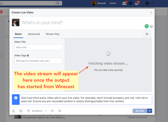 A screen like this will appear and Facebook will wait for your live video input. After 5-10 seconds, Facebook will report an error that it is not able to fetch any data because the output from Wirecast has not started yet. It’s ok.