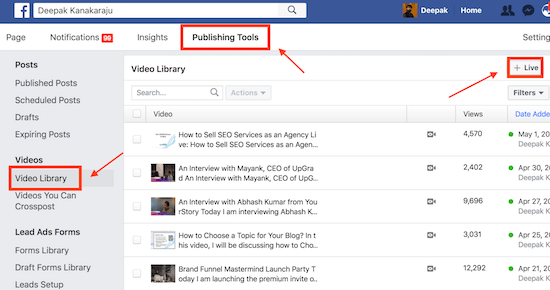Go to your Facebook Page and click on Publishing Tools. Click on Video Library. And Click on +Live.