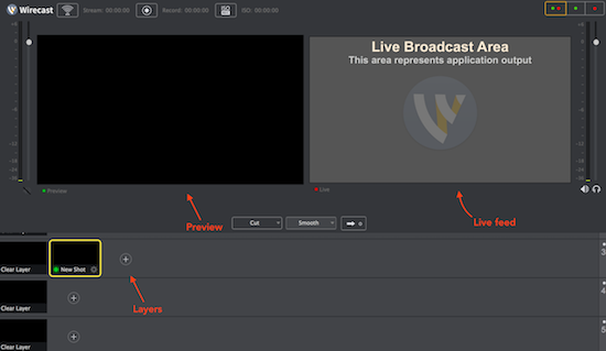 As soon as you open Wirecast, you will see two main video windows. The one on the left is the preview window which is ready to go live. The one on the right is the actual live feed that is being sent out. When you click the -> arrow, the preview will become live.