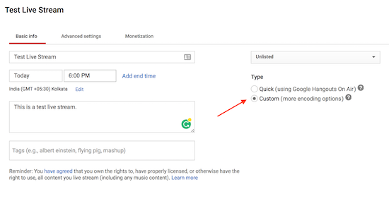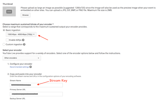 Since you are streaming the video via an RTMP server, the steps are similar. Just create a YouTube live event, select Custom instead of Quick in the settings.