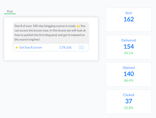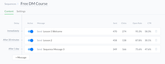I’ve been using it only for 2 days, but the results are promising. The open rates are close to 90% and click rates are always above 20% (which is unheard of with email marketing). In the following drip sequence you can see that the click rates ranges from 30% to 58%!