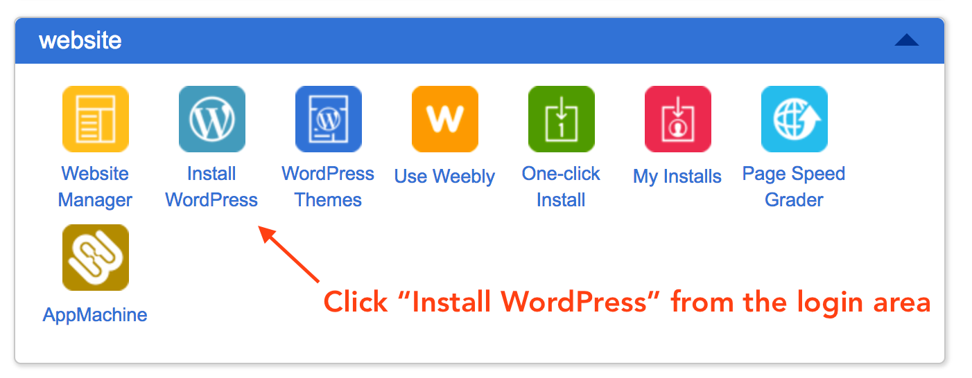 Once you log in, you will see a dashboard like this. BlueHost comes with 1-click WordPress install. Find Install WordPress in the website section and click on it.