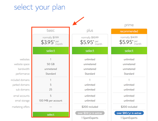 Select the basic plan from the next screen. The basic plan is more than enough for new bloggers. The price will show as $3.95 a month but we can reduce it further in the next step.