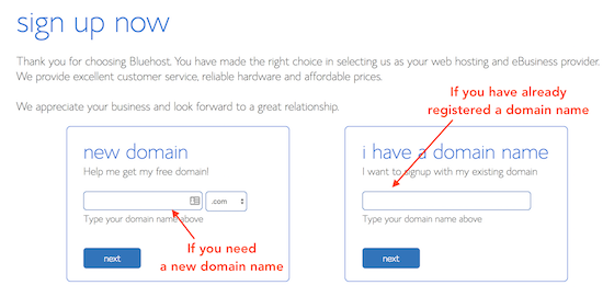 If you have registered a domain name already, go ahead and enter the domain name there. Else, enter a new domain name that will be registered for you along with your BlueHost plan.