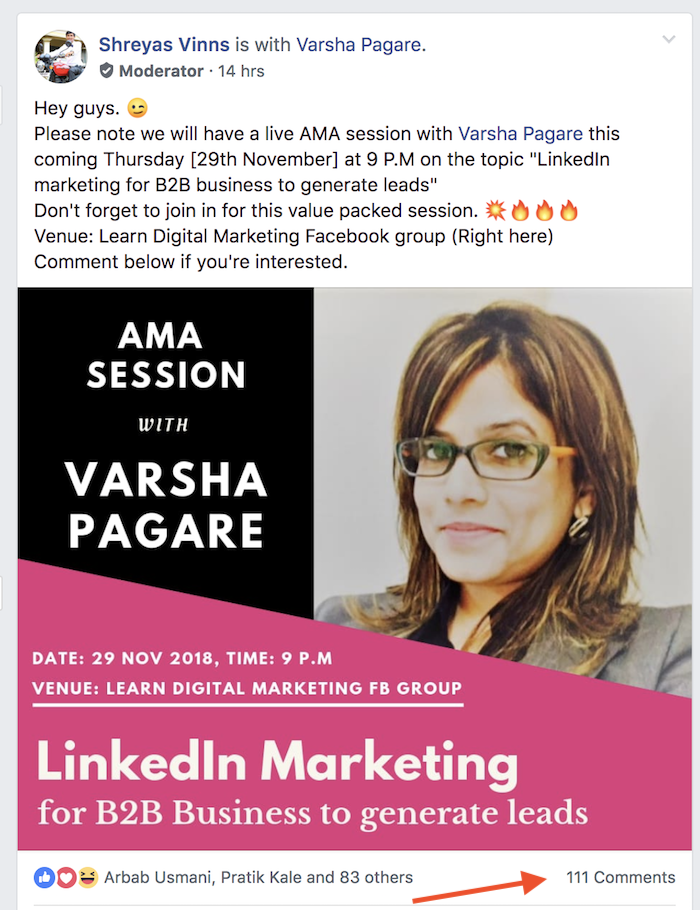 Here’s one AMA we’ve announced recently. This post, by one of our team members who manage the group, announcing the AMA by Varsha has already got 100+ comments within 14 hours of posting.