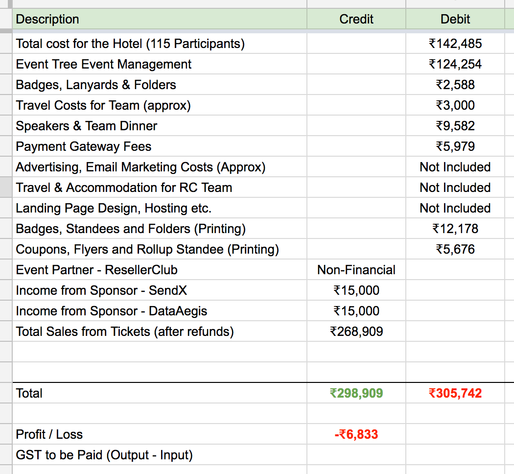 So here’s a glimpse of the accounts we finalized for HighTraffic Summit™ Bangalore. We are at a loss of ₹6,833. But we are doing this for the first time and we are building our brand and the community.