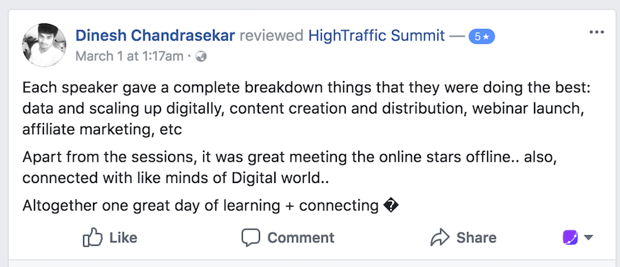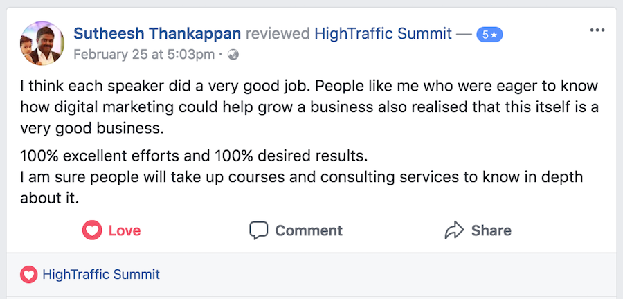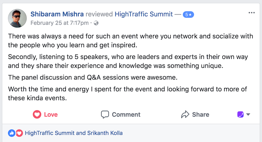 We invite speakers who are experts in their area of work and also have a following of their own. When they announce that they are speaking at HighTraffic Summit™ their followers get to know about us and might become our customers in the future. And in turn we give visibility to the influencers and speakers to our BIG follower base. It’s a win-win for everyone.
