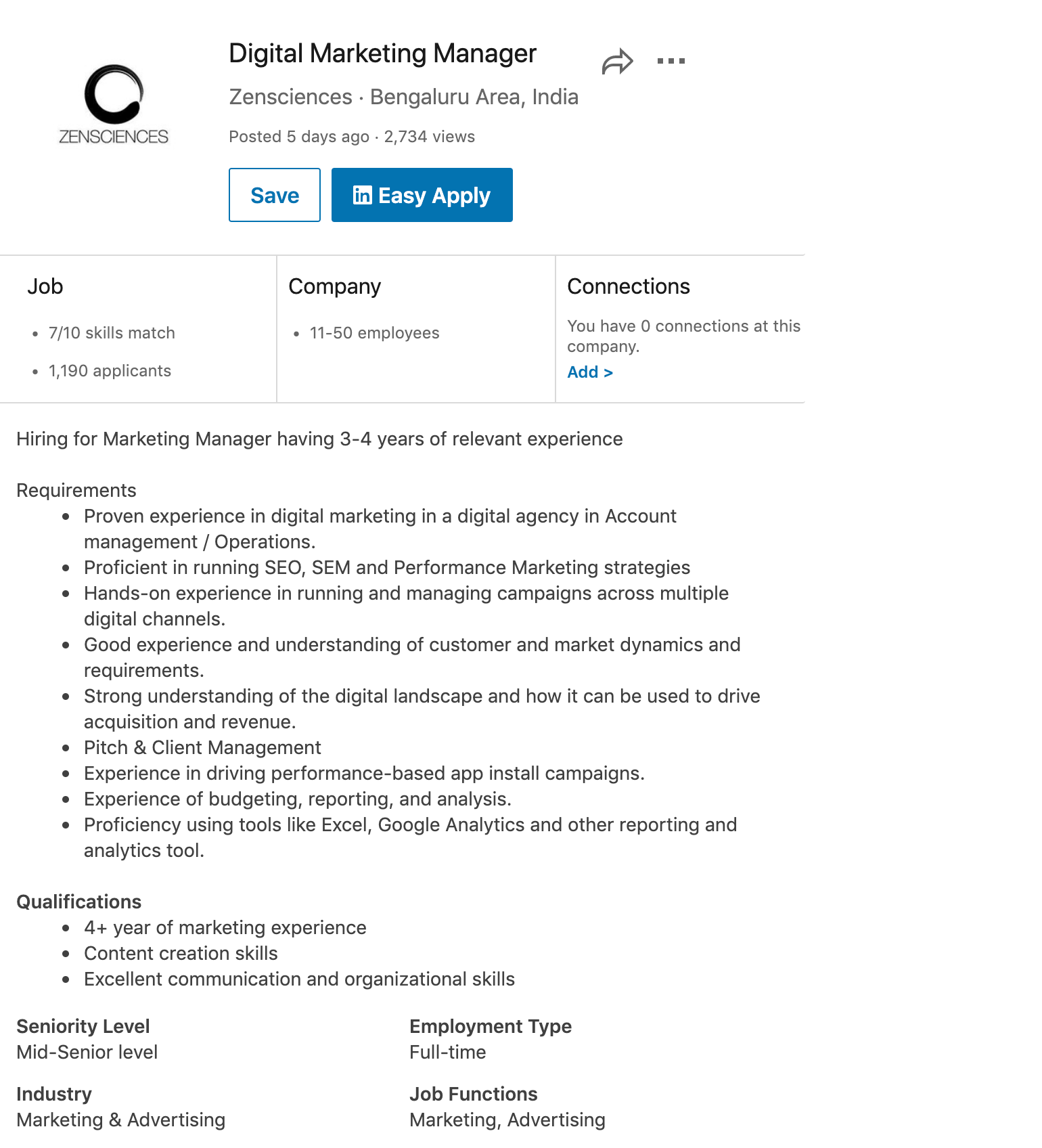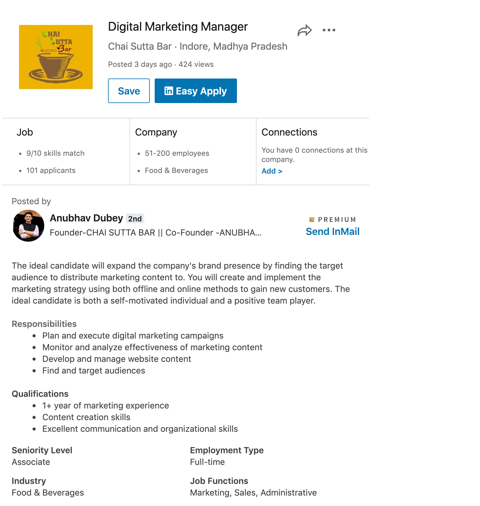 Let’s take one of them. This company Chai Sutta Bar is hiring a digital marketing manager for their company. They have 50+ employees and there doesn’t seem to be too many applicants.