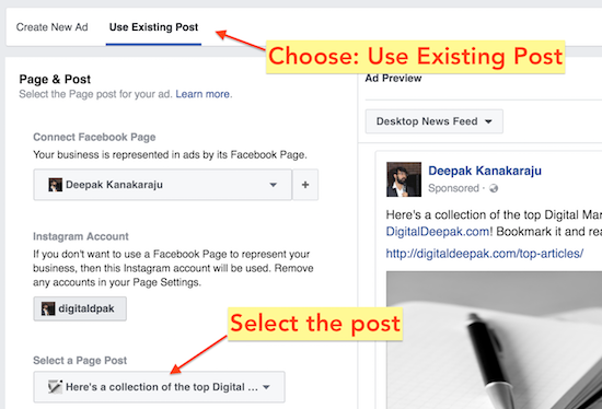 Once you have selected the target audience, then Facebook will ask you to create an Ad. When you create a new Ad, it is just like any other Facebook Post that you make on your page, but the Ad post is hidden from the main feed. Instead of creating an ad, we are going to use an existing post.