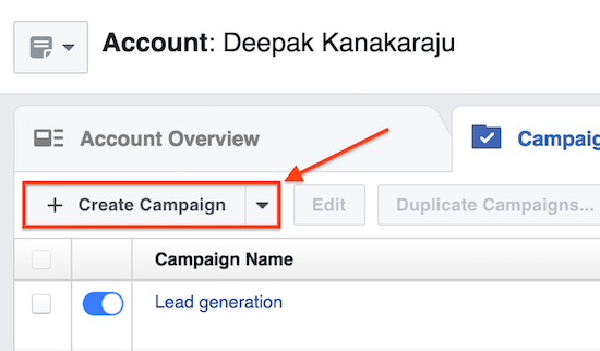 You don’t need to use the power editor for this. You can get this done with the ads manager. Go into the Facebook Ads Manager and click on + Create Campaign.