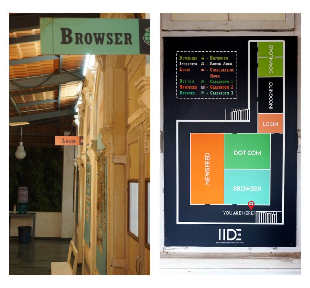 When I entered IIDE’s campus I saw a map put up to help the students navigate the campus. At first, I wasn’t sure if it was a map or just a piece of decor as it looked like a quirky representation of digital concepts like “browser” and “login”. As I walked further, I realised that it was the names of their cabins and classrooms.