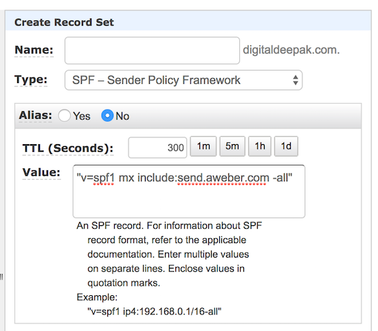 I am using Aweber for most of my outgoing email. According to Aweber’s documentation, all I need to do is add “v=spf1 mx include:send.aweber.com -all” as a new SPF record in my domain name’s DNS.