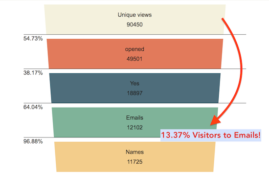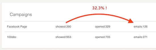 In another page which hosts an article on Facebook, I’ve 126 emails from 390 unique impressions. That’s 32.3% conversion! I’ve never seen such conversion ratios with any other tool!