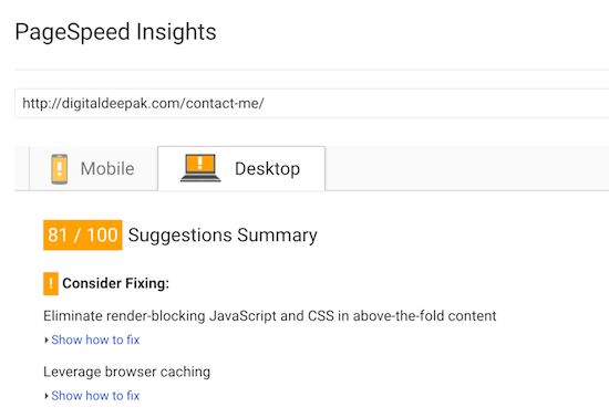One of the pages on my blog tested with page speed insights gave the following results.