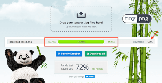 The above screenshot was compressed using TinyPNG and you can see that I reduced the size by 72% from 160kb to 44kb!