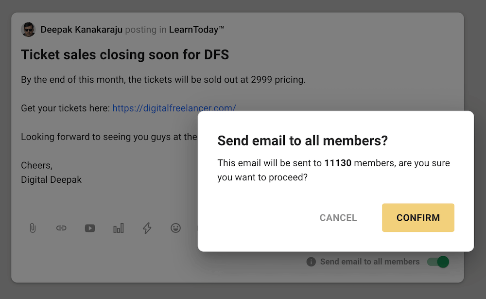 One of my favorite features here is the ability to send an email update to all the members. This email update is going to bring back people to the community for engagement.