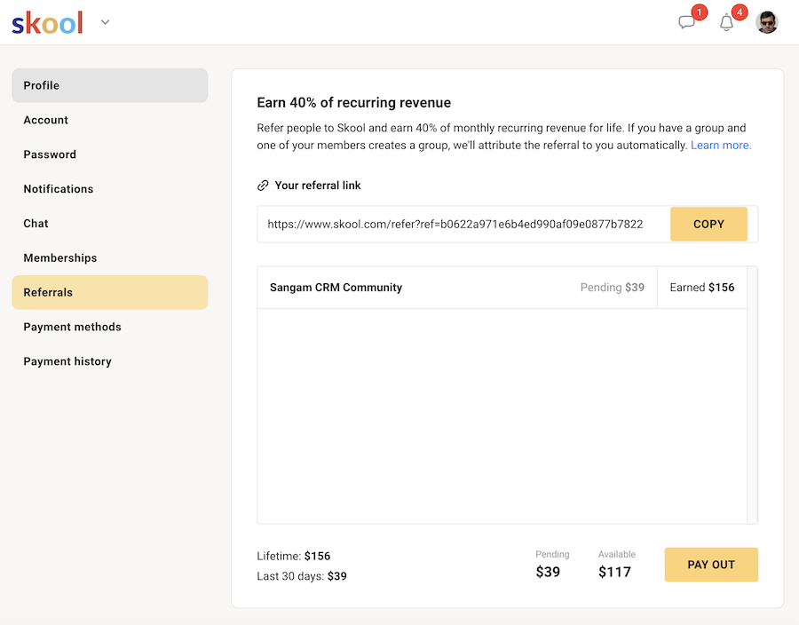So far I have referred one person who has become a paying member and has made $156 so far. Just referring 3 members will make sure that your own cost of Skool membership is covered.
