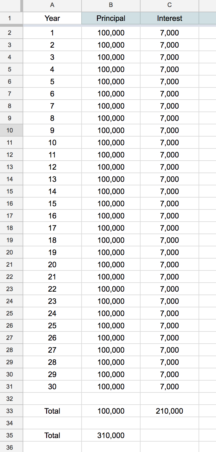 The principal of 1 lakh would have remained and you would have earned a total of 2.1 lakhs in interest over 30 years.