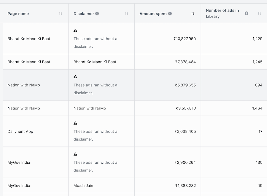 ‘Bharat Ke Mann Ki Baat’ page is the top spender with almost 1 crore INR per week spend and more than 1,200 Ads in the library. Apart from Facebook, they might be spending money on Google Ads and YouTube ads as well.