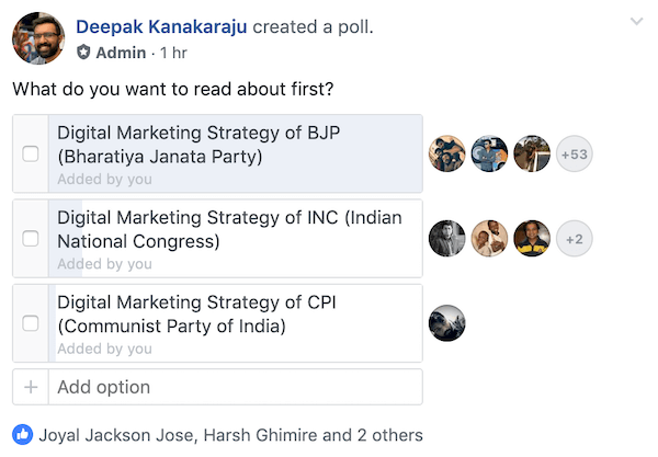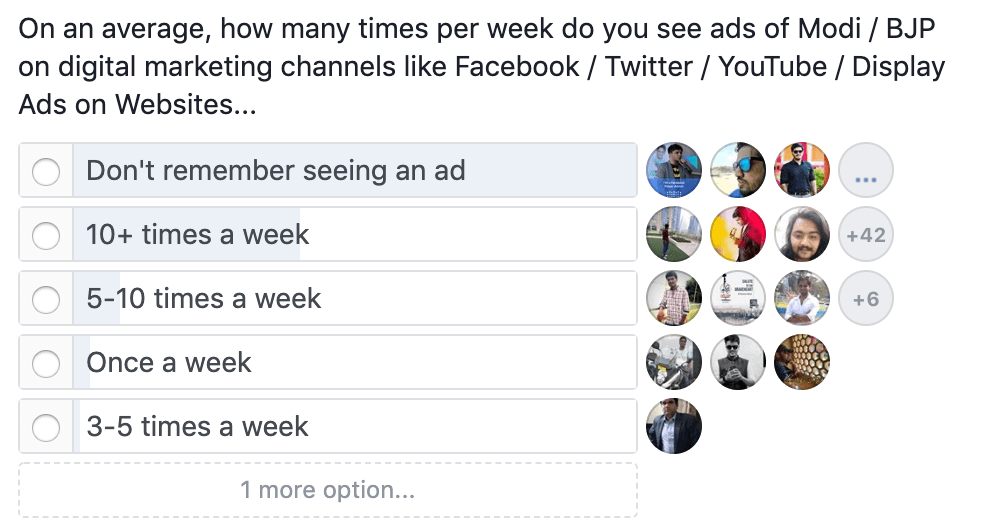 Though the ad spend looks like a lot, not everyone has observed ads. In a poll conducted in my Learn Digital Marketing Group, a majority of people have said that they do not remember seeing an ad for BJP in any of the social media marketing channels. A few people have observed ads more than 10 times a week.