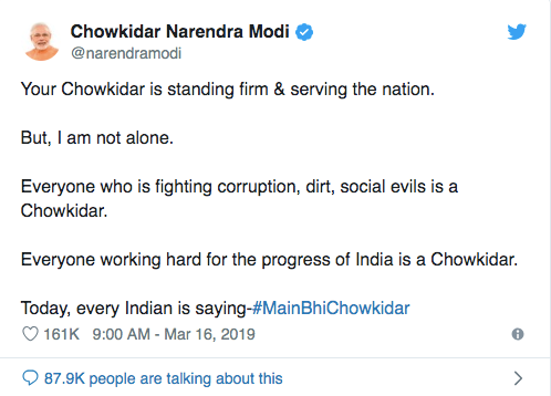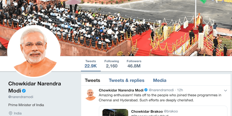 In particular, the latter example has been generating enormous amount of traction recently. Leaders of the party, and citizens are seen updating their names on social media and thereby showing their support by prefixing the word ‘Chowkidar’ to their names.