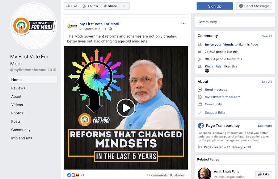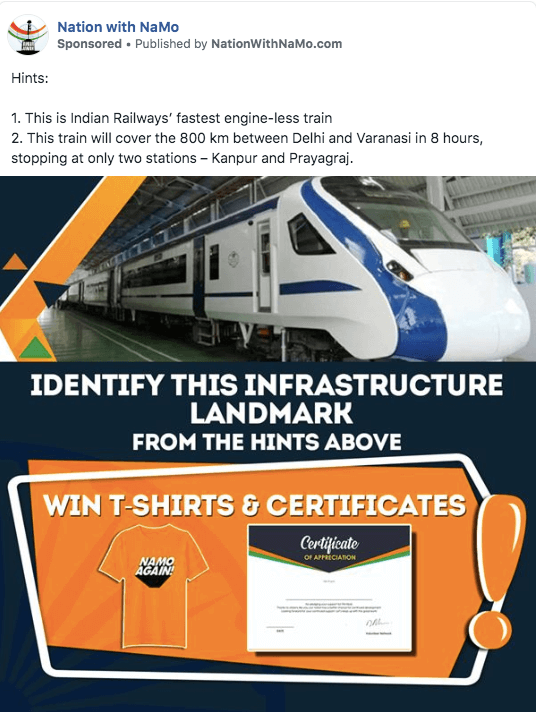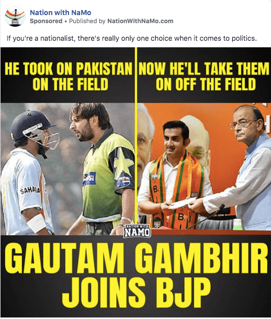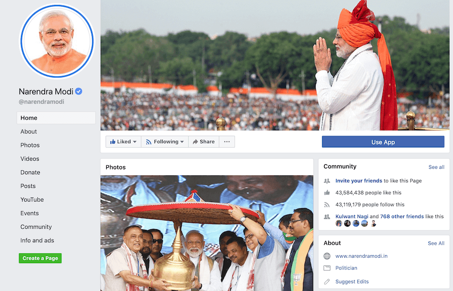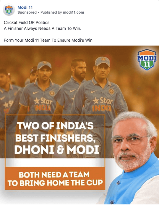 On the other hand, in the page ‘Modi 11’, they’re leveraging the fame of Dhoni to win the attention and interest in their favor. Finally, the ‘Nation With Namo’ page is all about sharing the association of powerful influencers with the Modi government to appeal to all kinds of audiences.