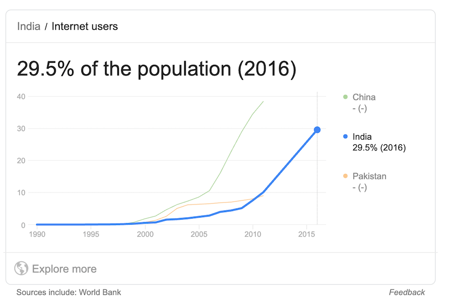 According to World Bank Stats, 29.5% of the Indian population have access to Internet. 10 years back, the internet penetration was less than 3%,
