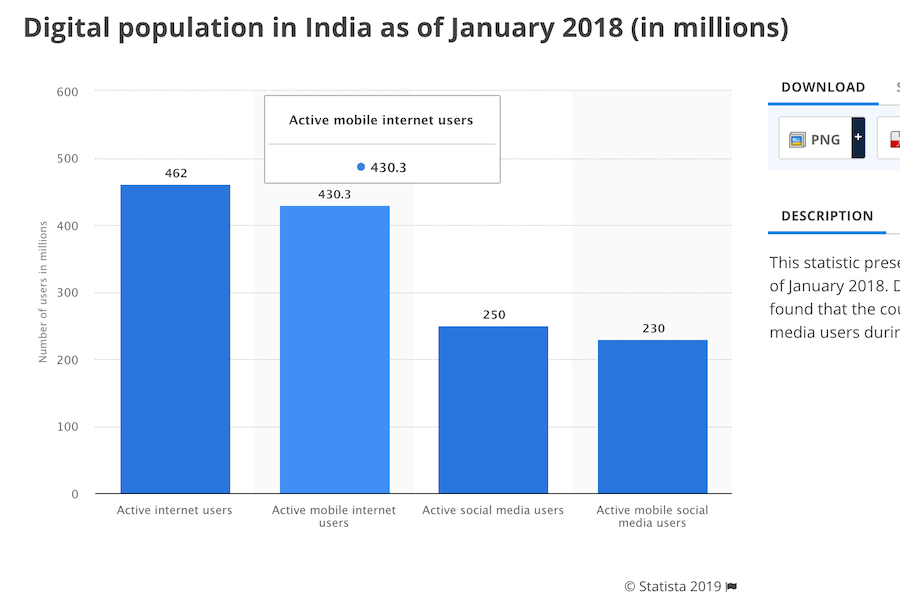 As per Statista, the estimated number of Mobile Internet users in India as of 2018 is around 430 million.