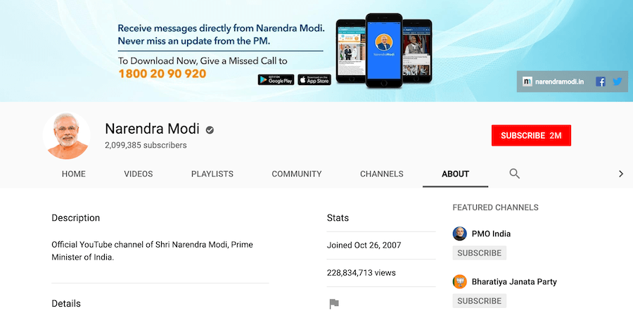 For example, Mr. Modi also has a verified YouTube Channel where he has 2 million subscribers. All the videos combined has got 228 million views so far.