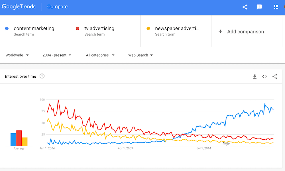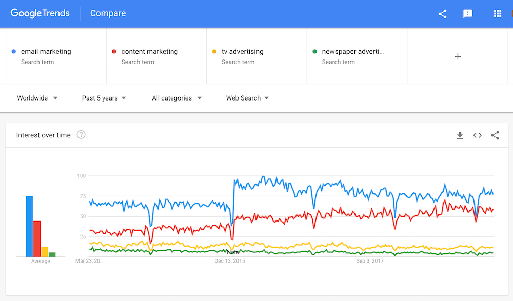 From the Google Trends data, we can see that components of digital marketing such as email marketing and content marketing is now more popular than traditional marketing mediums such as TV and Newspapers.