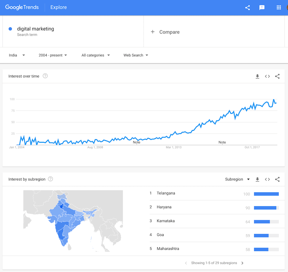 I have been in the digital marketing industry for the past 10 years. In the past 5 years, the trend of digital marketing has seen a hockey stick growth. If you check Google Trends for the popularity of the term “digital marketing”, you can see how it has grown since 2004.