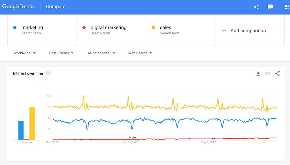 In the above Google Trends comparison between Marketing, Digital Marketing and Sales, you can see that marketing and sales have a consistent interest across years and digital marketing is hardly anywhere near marketing in terms of popularity.