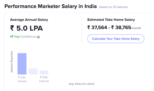 According to AmbitionBox, a performance marketer makes an average of 5L per annum with 17L being the highest possible salary.