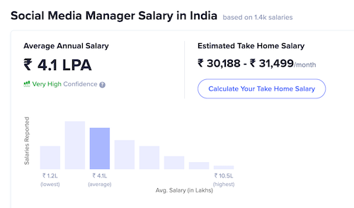 According to AmbitionBox, the avg salary of a social media manager in India is 4.1L per annum with 10.5L being the highest possible salary.