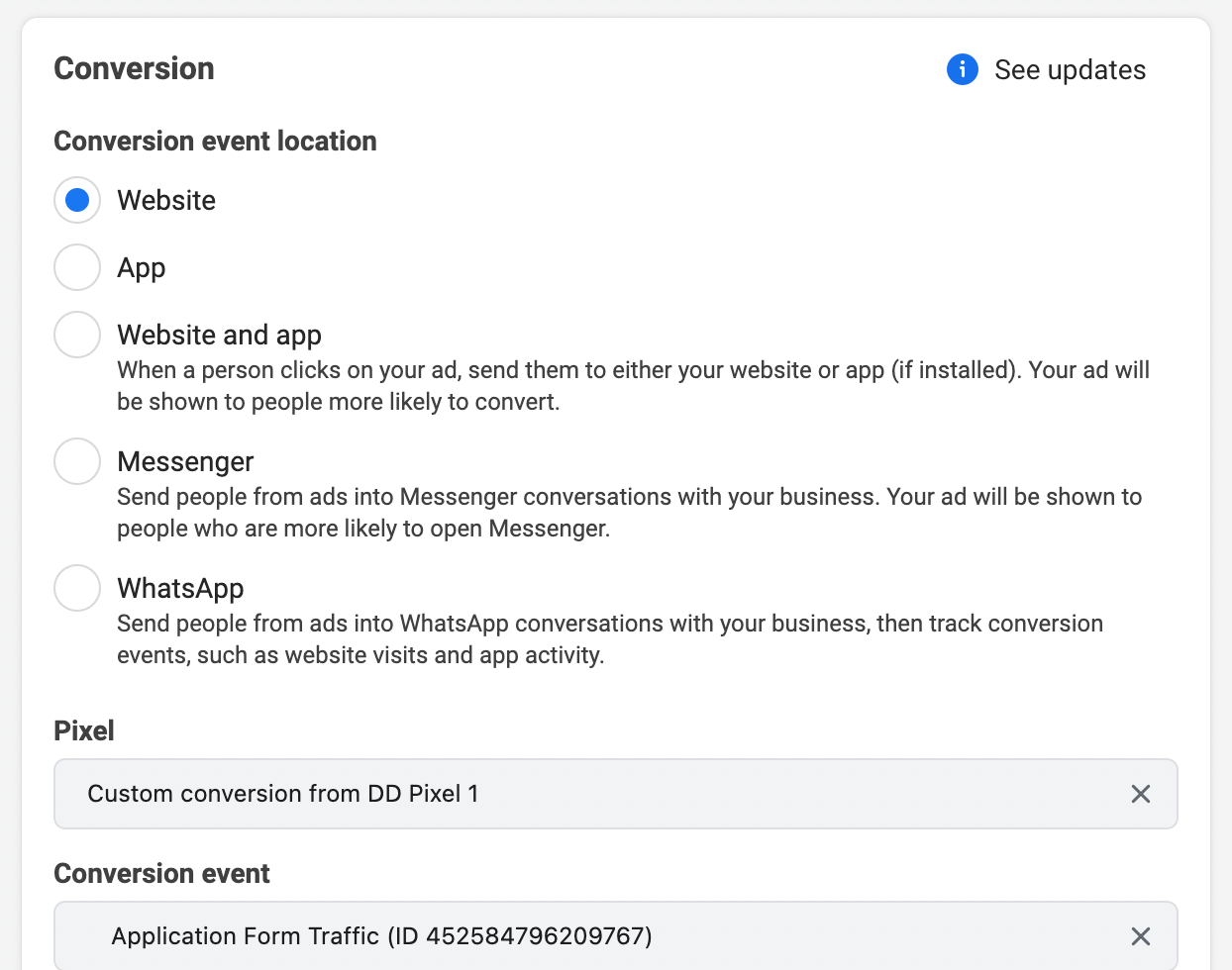 Go to “Create” in your Facebook Ads Manager and select “Conversions” from the next step. Edit the Campaign name and click next again. You will be able to define what is the conversion event. Select “Website” because we are going to track conversions based on website visitors. Within “Website”, you will be able to select the custom conversion you have created.