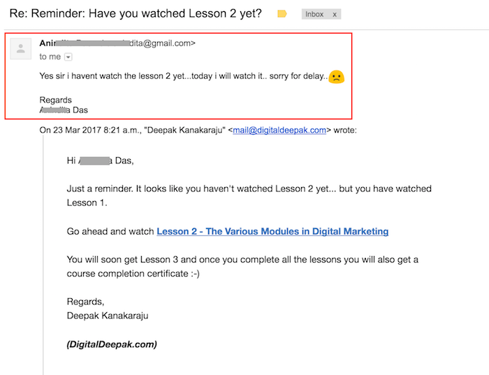 For example, when users start my free digital marketing course, they start getting the lessons in sequence. But I track if they have read the lessons or not and mail them according. Have a look at the reply I received for an email that I sent to a user who has watched Lesson 1 but not Lesson 2.